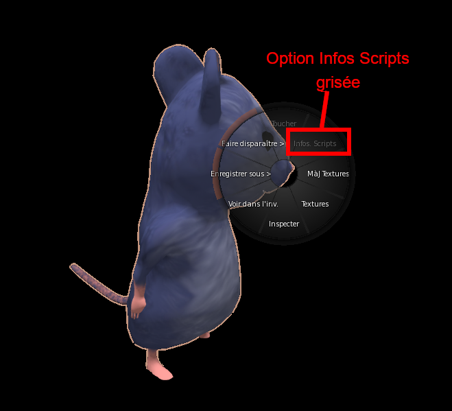 Menu contextuel dans Firestorm qui montre l'option Infos Scripts grisée.