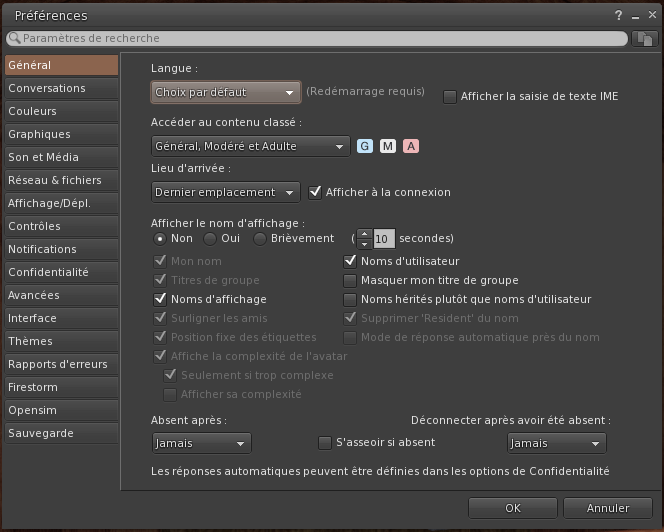 Capture de la page "Général" des préférences de Firestorm.