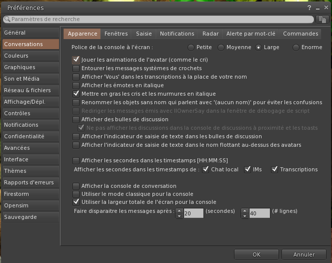 Capture de la page des conversations des Préférences de Firestorm : Apparence