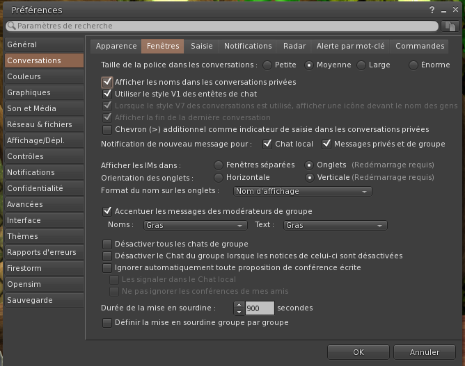 Capture de la page Conversation des préférences de Firestorm : Fenêtres.