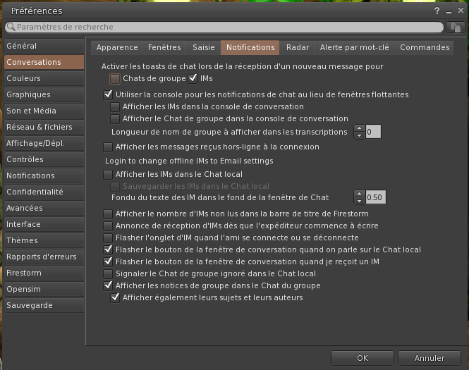 Capture de la page Conversation des préférences de Firestorm : Notifications