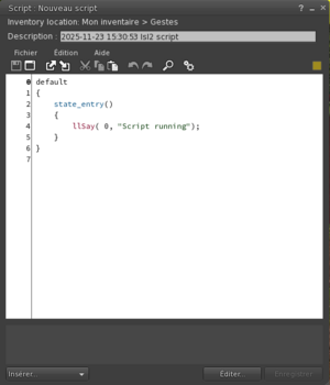 - Bouton Insérer... : menu déroulant qui liste l'ensemble des fonctions et constantes des langages LSL et OSSL que vous pouvez insérer dans votre code.