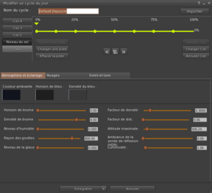 - Un paramètre de cycle de jour définit plusieurs jalons sur toutes la durée d'une journée. Ainsi, il est possible d'attribuer un ciel et / ou une eau à chaque jalon. Pendant la durée d'un cycle qui peut compter jusqu'à 168 heures, c'est à dire une semaine, l'environnement va progressivement passer d'une configuration à l'autre.