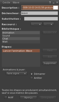 - Bibliothèque': permet de sélectionner le type d'item qui sera ajouté au geste. Ces types peuvent être Animation, un son Sound, un message avec Chat, une pause Wait.