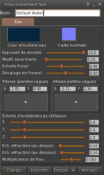 - Un paramètre d'eau définit l'apparence de l'eau dans une parcelle : sa couleur, son relief, l'orientation des vagues, etc.