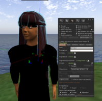 • Si vous utilisez l'option Modifier d'un objet porté par l'avatar, l 'éditeur de l'objet s'ouvre et l'avatar reste figé dans la position qu'il avait lorsque vous avez cliqué sur Modifier. L'objet est mis en surbrillance, il est cerclé de bleu ciel. Un repère 3D avec les axes x, y, et z s'affiche pour l'objet. Vous pouvez utiliser une pose en T avant d'utiliser cette option, cela vous facilitera sans doute la tâche. Vous trouverez ces poses (tpose et tpose2) dans le dossier OpenSim Library > Animations de votre inventaire.