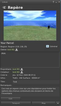 • URL Hypergrid : Bien qu'il soit possible de créer un repère en hypergrid depuis le viewer, l'URL que cette option affichera sera soit vide soit le domaine de la grille distante sera remplacé par celui de votre grille d'origine.