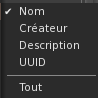 - Tout : affiche tous les items correspondant au Nom, ou au Créateur, ou à la Description ou à l' UUID qui contient tout ou partie de la chaîne de caractères entrée dans le champ de recherche de l'inventaire.