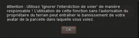 - Le propriétaire d'un terrain peut empêcher les visiteurs de voler 📖 sur son terrain. Il est possible d'ignorer cette interdiction. Pour plus d'informations, consultez la page Ignorer l'interdiction de voler 📖. Toutefois, c'est à vos risques et périls. Le message d'avertissement ci-dessous vous sera envoyé.