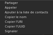* Permet de copier [https://fr.wikipedia.org/wiki/Uniform_Resource_Identifier '''l'URI'''] de l'avatar : il a la forme ''hop://<domaine>:<port>/app/agent/<UUID>/about''. En collant l'URI d'un utilisateur dans le chat, son nom s'affiche, ainsi tous les participants à la conversation peuvent cliquer sur ce nom et ouvrir le profil correspondant. | |||