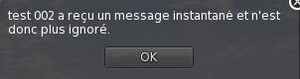 * Si vous envoyez un message privé à un utilisateur bloqué, le blocage cesse. Le viewer envoie un message pour vous informer de ce changement : « <nom> a reçu un message instantané et n'est donc plus ignoré ». | |||